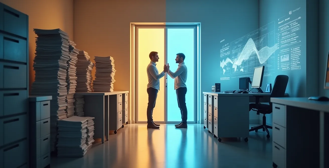 Die digitale Transformation wird oft missverstanden als die bloße Digitalisierung bestehender analoger Prozesse. Ein papierloses Büro oder eine automatisierte Rechnungsprüfung sind jedoch nur die Spitze des Eisbergs. Sie repräsentieren Effizienz, aber nicht zwingend strategische Weiterentwicklung. Die wahre Transformation beginnt, wenn Unternehmen Technologie nutzen, um ihr grundlegendes Geschäftsmodell infrage zu stellen und neue Wertangebote zu schaffen. Es ist der Unterschied zwischen einem Taxiunternehmen, das eine App zur Buchung anbietet, und einem Unternehmen wie Uber, das das gesamte Konzept von Mobilität neu definiert hat.